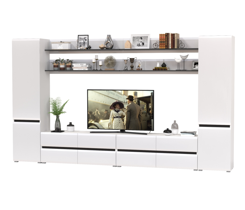 Комплектация состоит из двух тумб под ТВ Сидней 13.63, четырех полок открытых Сидней 16.486 и двух шкафов с дверками Сидней 13.200.