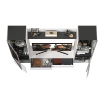 Верхнее отделение со стеклянной дверкой, за которой располагаются три стеклянные полки. За глухой дверкой нижнего отделения имеется одна полочка. Чёрная задняя стенка эффектно подчеркивает наполнение шкафов.