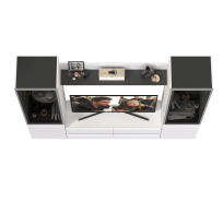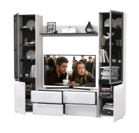 Комплектация состоит из тумбы под ТВ Сидней 13.63, полки открытой Сидней 16.486 и двух шкафов с фасадами стекло Сидней 13.201.