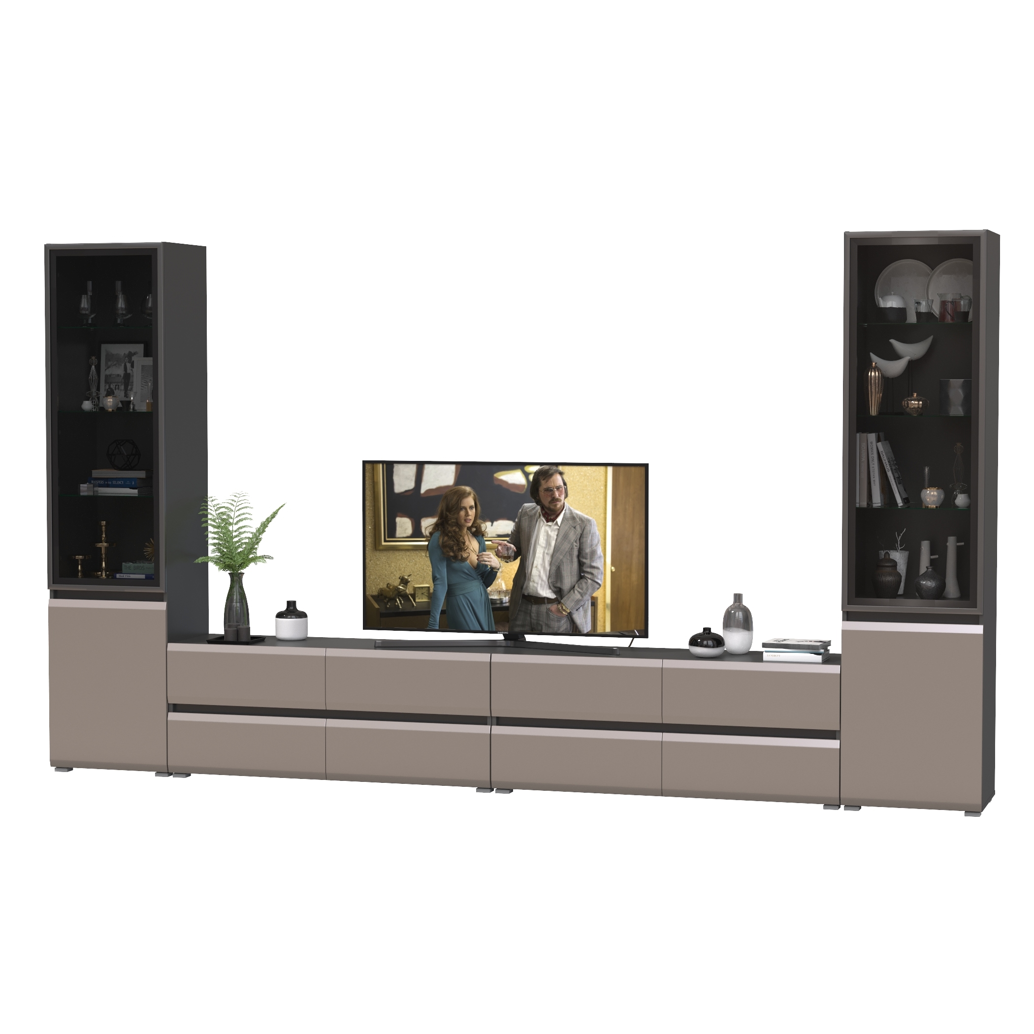 Комплектация состоит из двух тумб под ТВ Сидней 13.63 и двух шкафов с фасадами стекло Сидней 13.201.