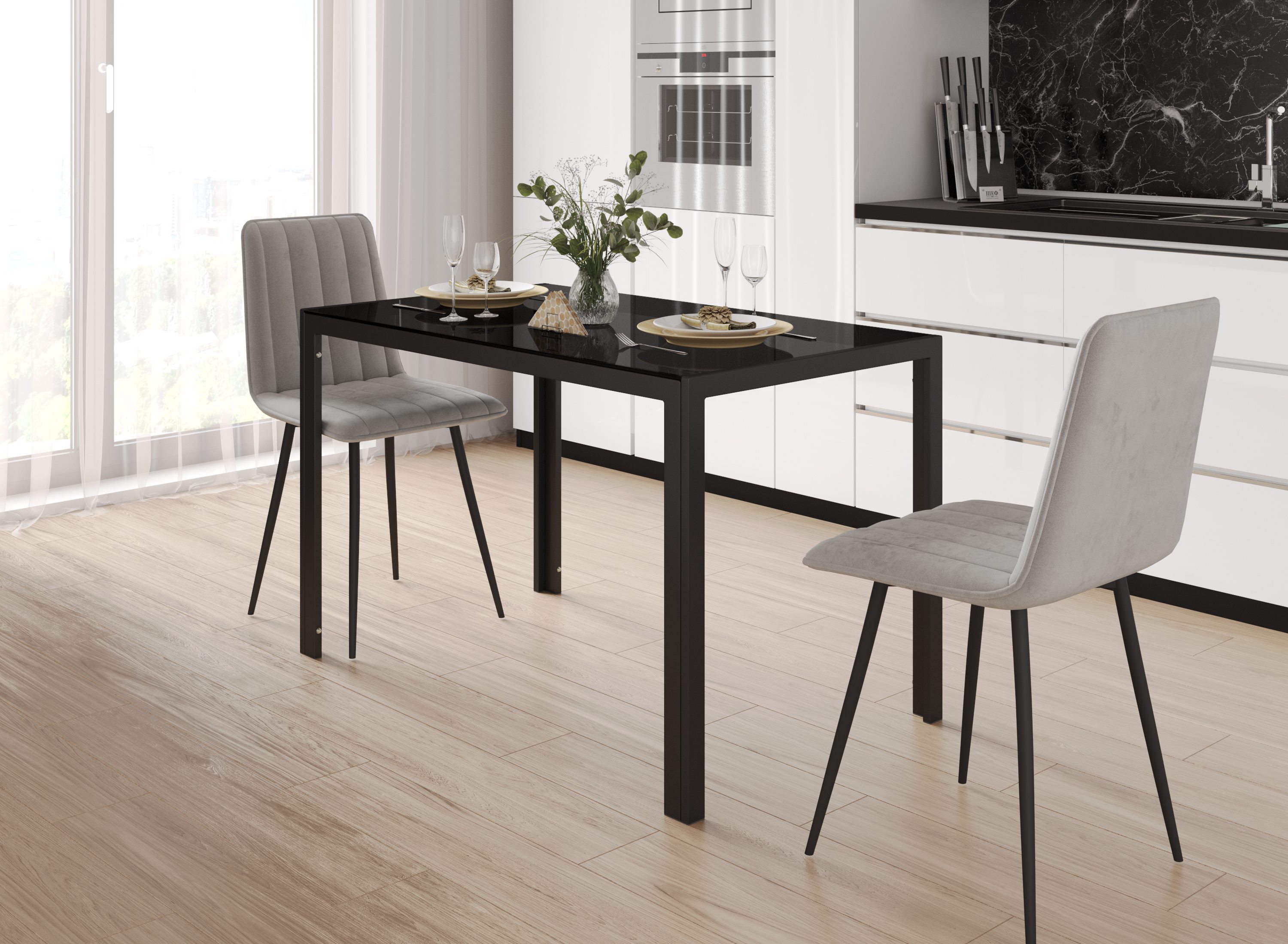 Столешница выполнена из прочного закалённого стекла толщиной 6 мм, что обеспечивает устойчивость к механическим повреждениям и долговечность. Её размеры 120х70 см идеально подходят для семейных обедов или встреч с друзьями. Фиксация столешницы осуществляется с помощью присосок, что обеспечивает её устойчивость и безопасность в использовании. По краям столешница ограничена металлическим профилем, который соединяется с ножками, подчеркивая современный дизайн. Максимальная нагрузка на столешницу составляет 80 кг, что гарантирует его долговечность и удобство для размещения различных предметов, включая посуду и декор.