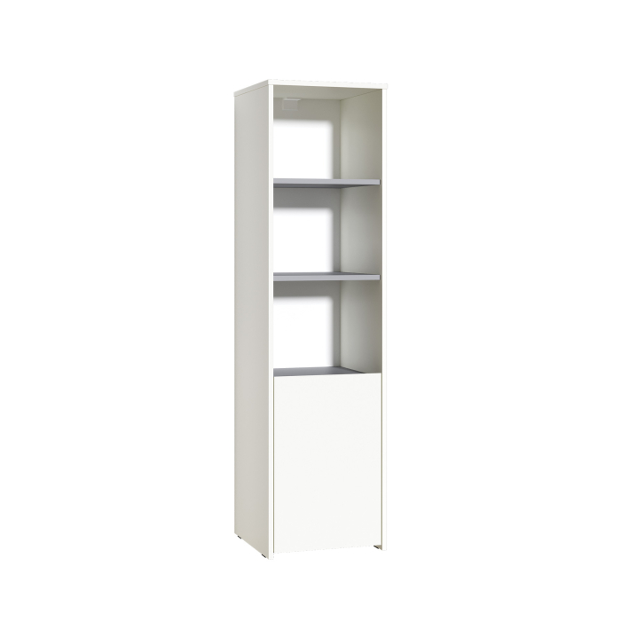 Лаконичная по форме модель оборудована тремя открытыми полками и распашным отделением с двумя полками. Отсутствие лицевой фурнитуры визуально расширяет пространство и придает мебели современный вид. Есть возможность прикрепить шкаф к стене. Максимальная нагрузка на полки по 5 кг.