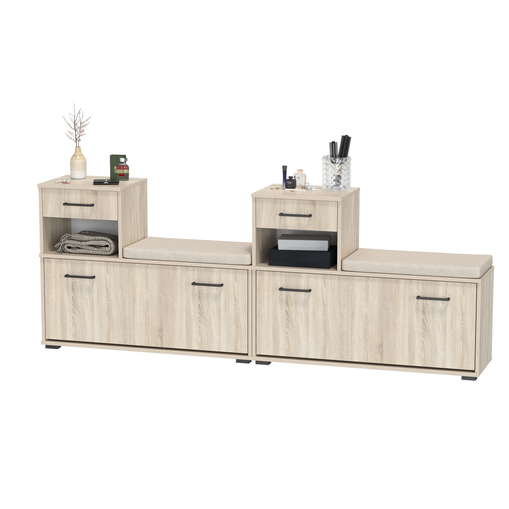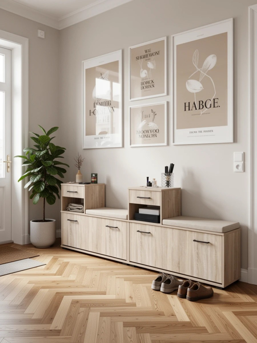 Обувницы спроектированы с учётом максимального удобства. Мягкие сиденья делают процесс обувания комфортным, особенно для малышей, а выдвижные ящики станут идеальным местом для хранения ключей и мелочей. Основной отсек, скрытый за откидной дверцей каждой обувницы, вмещает до восьми пар сезонной обуви, что делает его отличным выбором для семьи с детьми. Фасады оборудованы лаконичными ручками, выполненными в форме удлиненных тонких прямоугольников, без использования декора. Ручку приятно брать, ею легко и удобно открывать фасады. Благодаря универсальной сборке, обувницы можно легко адаптировать под новый дизайн интерьера, обновляя стиль вашей прихожей в соответствии с вашими предпочтениями.