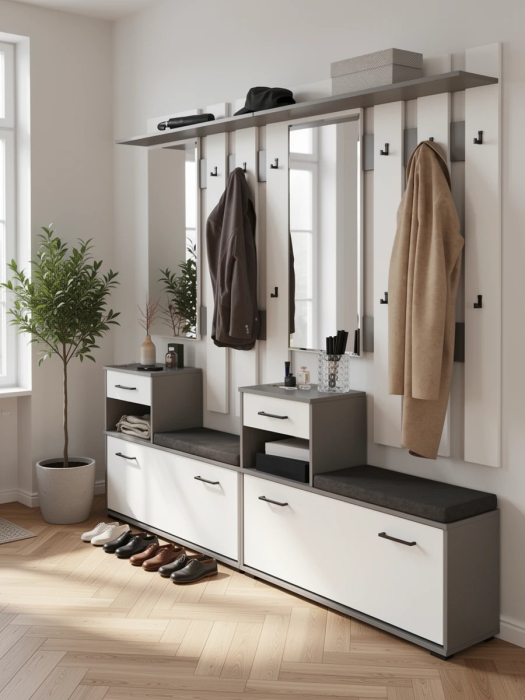 С этими элегантными и функциональными мебельными решениями ваша прихожая станет красивой, опрятной, удобной и современной. Каждый элемент набора тщательно продуман, чтобы создавать комфорт и поддерживать порядок. Тумбы под обувь решают множество задач - сохраняют обувь в чистоте, учат детей аккуратности и дополняют интерьер. Мягкое сидение тумбы обеспечивает удобство при обувании, выдвижной ящик позволяет быстро найти ключницу, а вместительное отделение за откидной дверцей рассчитано на восемь пар обуви, что идеально подходит для семьи. Фасады тумб украшены лаконичными ручками минималистичного дизайна, которые удобны в использовании. Вешалки с зеркалом обеспечивают удобное хранение сезонной одежды. Оснащённые шестью стильными крючками и антресольной полкой для головных уборов, они идеально подходят для организации пространства. Зеркала с фацетом украсят интерьер и помогут завершить образ перед выходом. Две прихожие в комплекте предоставляют больше возможностей для хранения, создания стильного интерьера и организации порядка в доме.