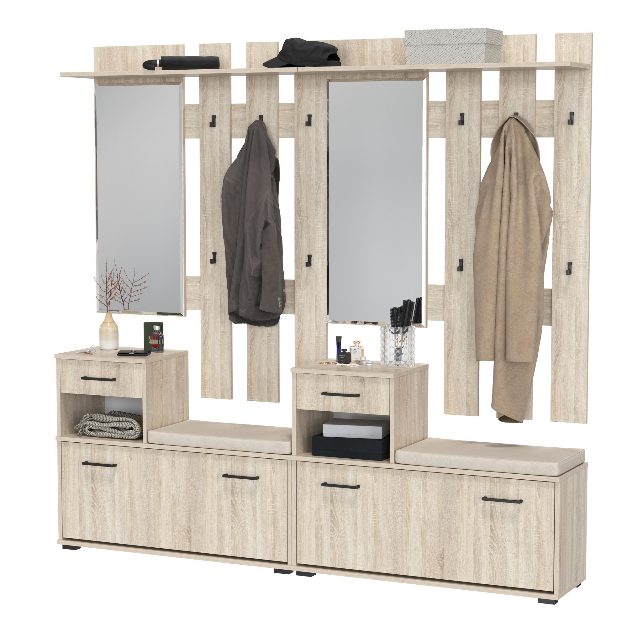 С этими элегантными и функциональными мебельными решениями ваша прихожая станет красивой, опрятной, удобной и современной. Каждый элемент набора тщательно продуман, чтобы создавать комфорт и поддерживать порядок. Тумбы под обувь решают множество задач - сохраняют обувь в чистоте, учат детей аккуратности и дополняют интерьер. Мягкое сидение тумбы обеспечивает удобство при обувании, выдвижной ящик позволяет быстро найти ключницу, а вместительное отделение за откидной дверцей рассчитано на восемь пар обуви, что идеально подходит для семьи. Фасады тумб украшены лаконичными ручками минималистичного дизайна, которые удобны в использовании. Вешалки с зеркалом обеспечивают удобное хранение сезонной одежды. Оснащённые шестью стильными крючками и антресольной полкой для головных уборов, они идеально подходят для организации пространства. Зеркала с фацетом украсят интерьер и помогут завершить образ перед выходом. Две прихожие в комплекте предоставляют больше возможностей для хранения, создания стильного интерьера и организации порядка в доме.