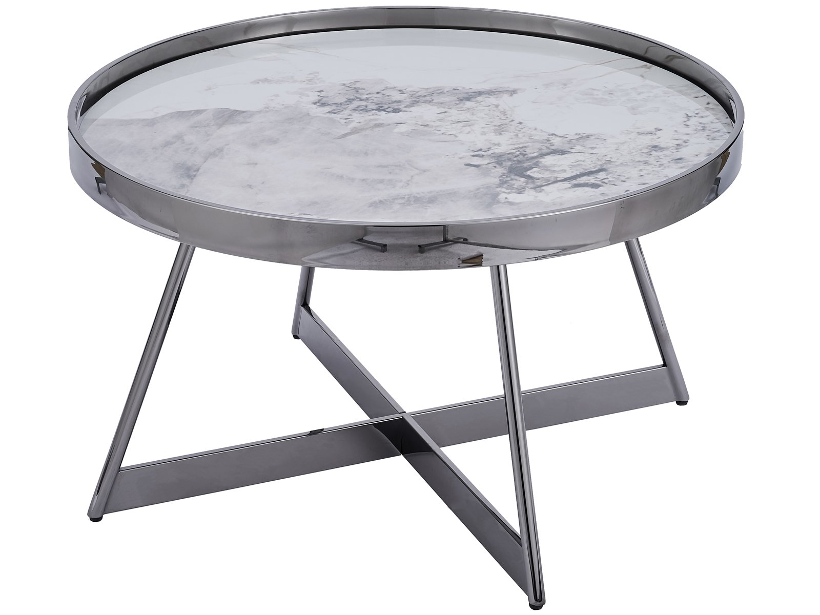Прочная конструкция столика полностью изготовлена из металла в цвете серебро. Круглая столешница из керамики мраморного рисунка мгновенно приковывает взгляд и завораживает, создавая яркий акцент.