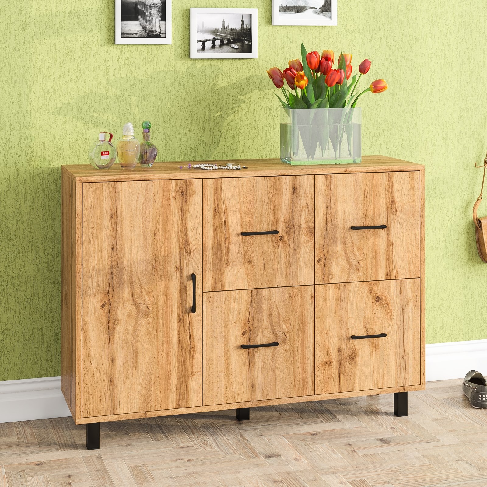 Комод оснащен просторным и продуманным функционалом. Слева находится распашная дверца (732х386 мм), за которой предусмотрена полка для аккуратного размещения вещей. Справа расположены четыре одинаковых выдвижных ящика, организованных в два ряда. Размер фасадов ящиков составляет 365х386 мм, что обеспечивает достаточную вместимость. Все ящики оборудованы шариковыми направляющими длиной 350 мм, что обеспечивает плавное и тихое выдвижение. Обратите внимание, что комод-тумба не имеет универсальной сборки - дверца расположена только слева, а ящики – справа. Комод установлен на черные металлические опоры высотой 100 мм, придающие конструкции устойчивость и современный внешний вид. Для удобства открывания двери и ящиков используются стильные металлические ручки длиной 128 мм черного цвета, которые гармонично дополняют общий дизайн.