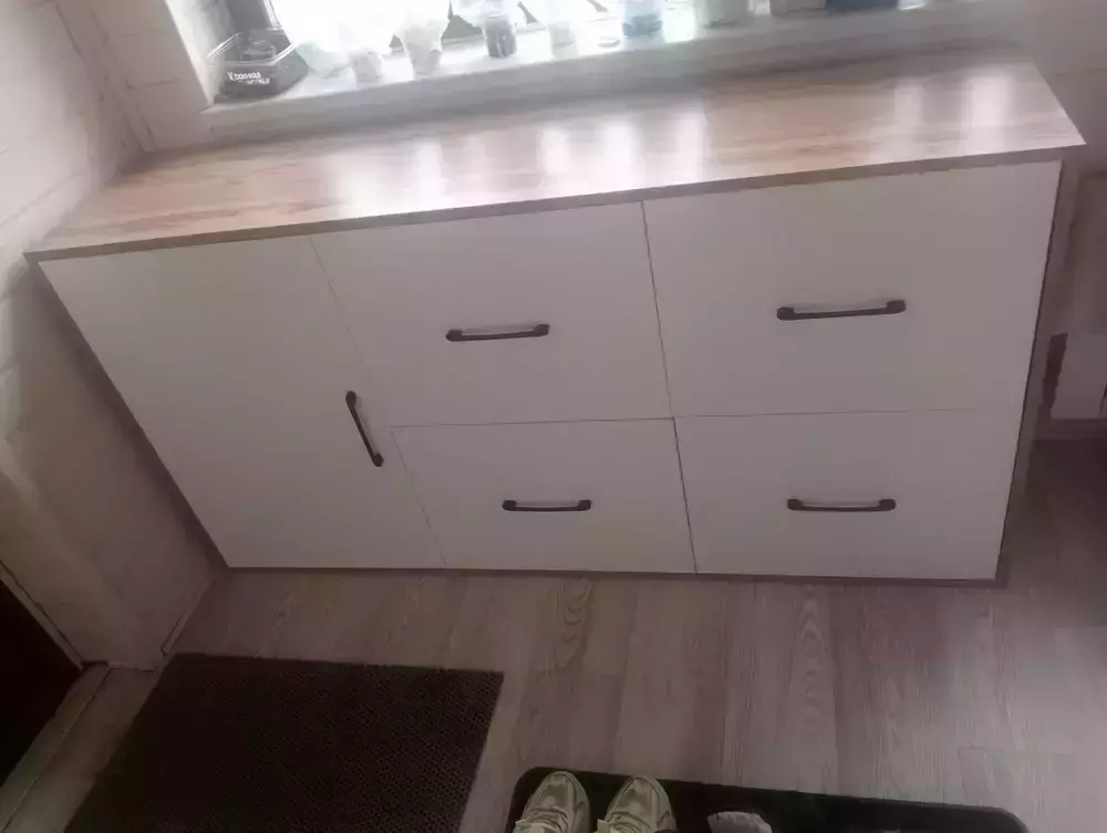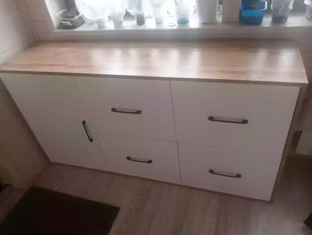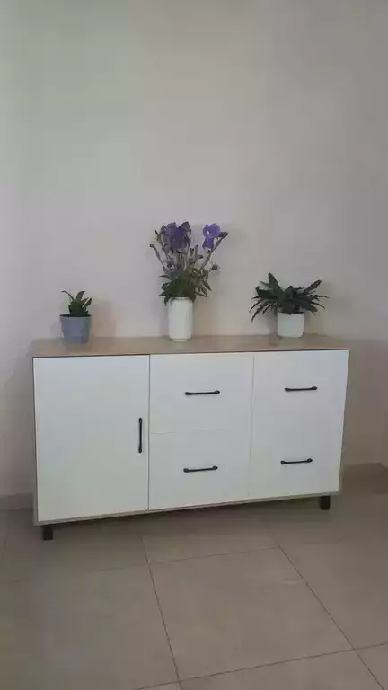 Комод оснащен просторным и продуманным функционалом. Слева находится распашная дверца (732х486 мм), за которой предусмотрена полка для аккуратного размещения вещей. Справа расположены четыре одинаковых выдвижных ящика, организованных в два ряда. Размер фасадов ящиков составляет 365х486 мм, что обеспечивает достаточную вместимость. Все ящики оборудованы шариковыми направляющими длиной 350 мм, что обеспечивает плавное и тихое выдвижение.