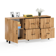 Комод оснащен просторным и продуманным функционалом. Слева находится распашная дверца (732х553 мм), за которой предусмотрена полка для аккуратного размещения вещей. Справа расположены четыре одинаковых выдвижных ящика, организованных в два ряда. Размер фасадов ящиков составляет 365х553 мм, что обеспечивает достаточную вместимость. Все ящики оборудованы шариковыми направляющими длиной 350 мм, что обеспечивает плавное и тихое выдвижение. Обратите внимание, что комод-тумба не имеет универсальной сборки - дверца расположена только слева, а ящики – справа. Комод установлен на черные металлические опоры высотой 100 мм, придающие конструкции устойчивость и современный внешний вид. Для удобства открывания двери и ящиков используются стильные металлические ручки длиной 128 мм черного цвета, которые гармонично дополняют общий дизайн.