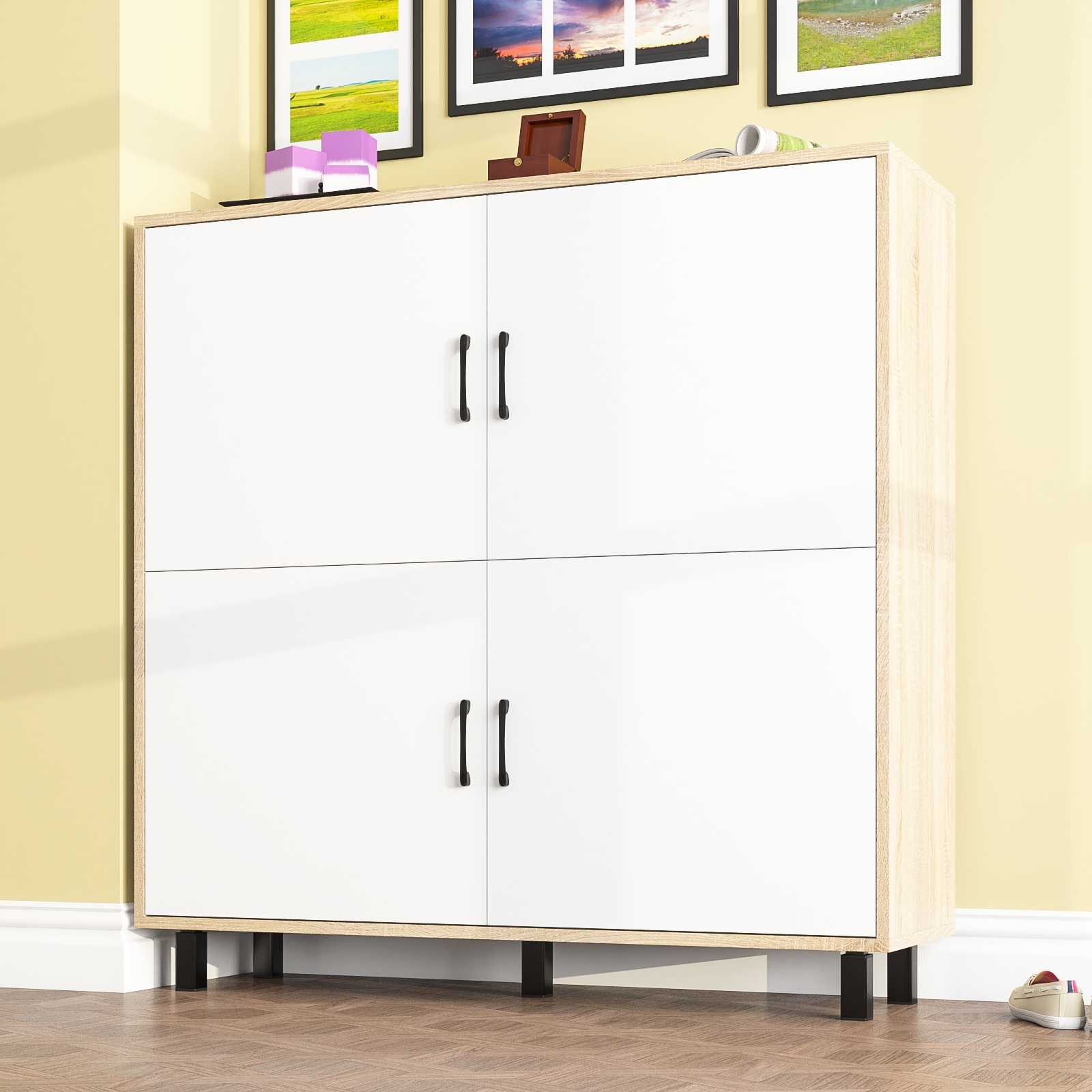 Тумба оборудована четырьмя распашными дверками, расположенными в два ряда по две – верхний и нижний. Размеры каждой створки составляют 530х580 мм, что обеспечивает удобство хранения и комфортный доступ к содержимому. За каждой парой дверок расположено отделение с полкой по центру, что позволяет эффективно организовать внутреннее пространство и хранить вещи в порядке. Тумба установлена на пять устойчивых металлических опор черного цвета высотой 100 мм, что придает конструкции современный вид и легкость. Для удобства использования створки открываются с помощью стильных металлических ручек длиной 128 мм, выполненных в минималистичном черном цвете.