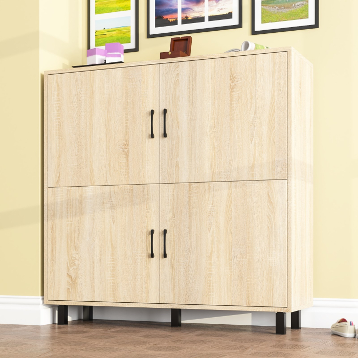 Тумба оборудована четырьмя распашными дверками, расположенными в два ряда по две – верхний и нижний. Размеры каждой створки составляют 530х580 мм, что обеспечивает удобство хранения и комфортный доступ к содержимому. За каждой парой дверок расположено отделение с полкой по центру, что позволяет эффективно организовать внутреннее пространство и хранить вещи в порядке. Тумба установлена на пять устойчивых металлических опор черного цвета высотой 100 мм, что придает конструкции современный вид и легкость. Для удобства использования створки открываются с помощью стильных металлических ручек длиной 128 мм, выполненных в минималистичном черном цвете.