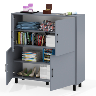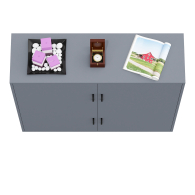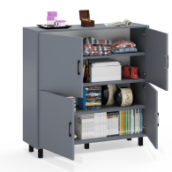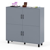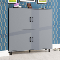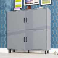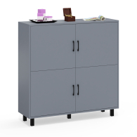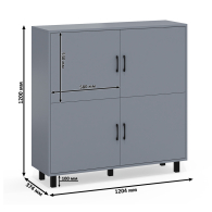 Тумба оборудована четырьмя распашными дверками, расположенными в два ряда по две – верхний и нижний. Размеры каждой створки составляют 530х580 мм, что обеспечивает удобство хранения и комфортный доступ к содержимому. За каждой парой дверок расположено отделение с полкой по центру, что позволяет эффективно организовать внутреннее пространство и хранить вещи в порядке. Тумба установлена на пять устойчивых металлических опор черного цвета высотой 100 мм, что придает конструкции современный вид и легкость. Для удобства использования створки открываются с помощью стильных металлических ручек длиной 128 мм, выполненных в минималистичном черном цвете.