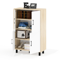 Тумба оборудована четырьмя распашными дверками, расположенными в два ряда по две – верхний и нижний. Размеры каждой створки составляют 530х380 мм, что обеспечивает удобство хранения и комфортный доступ к содержимому. За каждой парой дверок расположено отделение с полкой по центру, что позволяет эффективно организовать внутреннее пространство и хранить вещи в порядке. Тумба установлена на пять устойчивых металлических опор черного цвета высотой 100 мм, что придает конструкции современный вид и легкость. Для удобства использования створки открываются с помощью стильных металлических ручек длиной 128 мм, выполненных в минималистичном черном цвете.