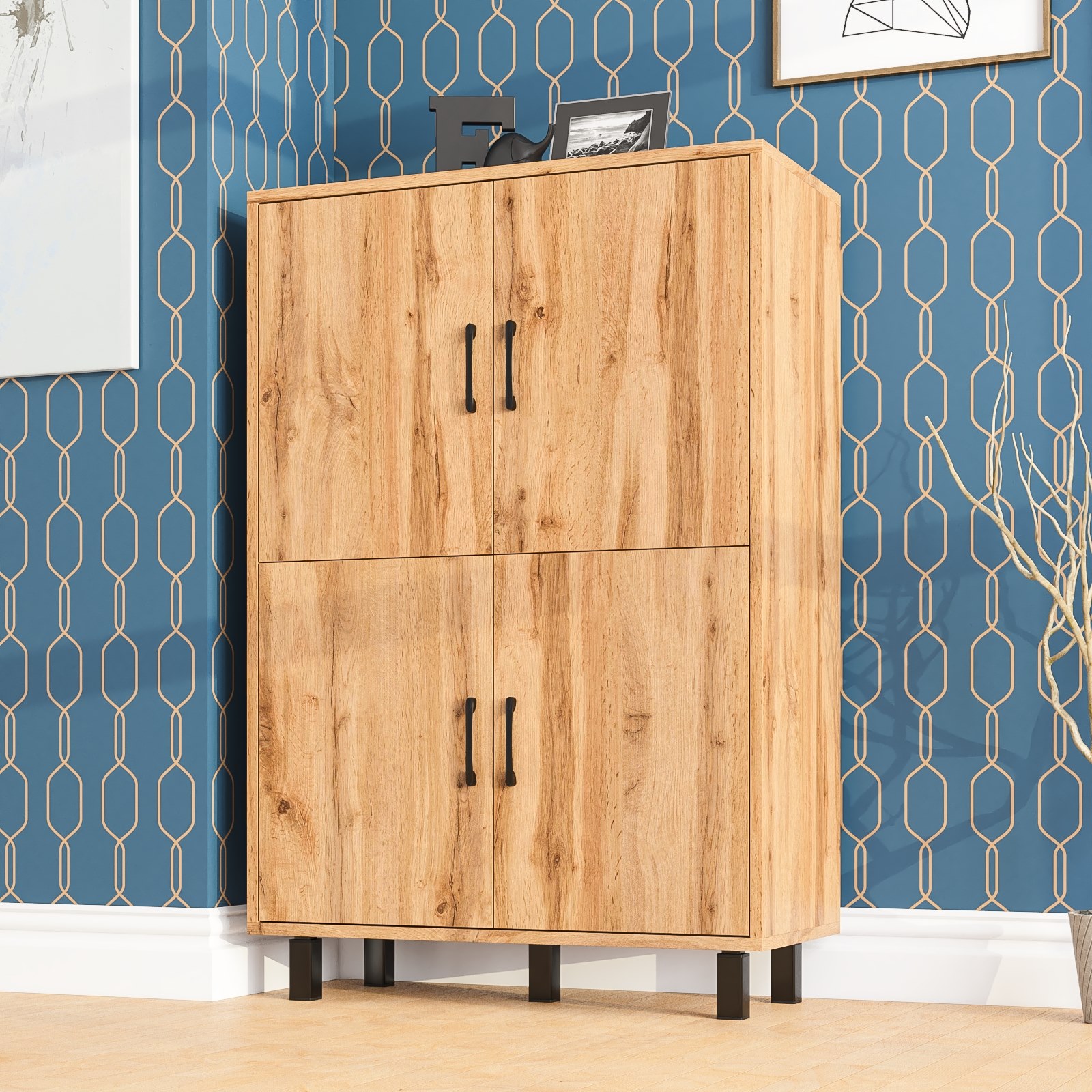 Тумба оборудована четырьмя распашными дверками, расположенными в два ряда по две – верхний и нижний. Размеры каждой створки составляют 530х380 мм, что обеспечивает удобство хранения и комфортный доступ к содержимому. За каждой парой дверок расположено отделение с полкой по центру, что позволяет эффективно организовать внутреннее пространство и хранить вещи в порядке. Тумба установлена на пять устойчивых металлических опор черного цвета высотой 100 мм, что придает конструкции современный вид и легкость. Для удобства использования створки открываются с помощью стильных металлических ручек длиной 128 мм, выполненных в минималистичном черном цвете.