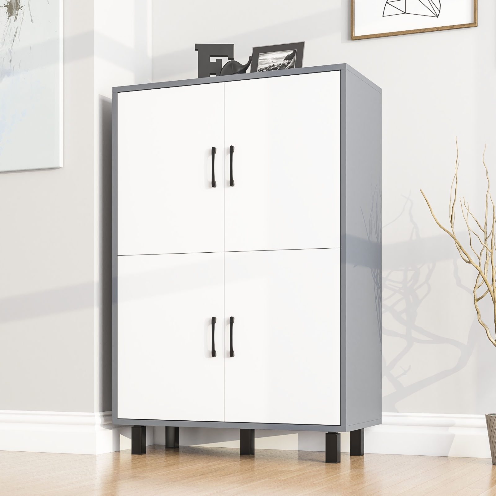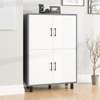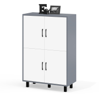 Тумба оборудована четырьмя распашными дверками, расположенными в два ряда по две – верхний и нижний. Размеры каждой створки составляют 530х380 мм, что обеспечивает удобство хранения и комфортный доступ к содержимому. За каждой парой дверок расположено отделение с полкой по центру, что позволяет эффективно организовать внутреннее пространство и хранить вещи в порядке. Тумба установлена на пять устойчивых металлических опор черного цвета высотой 100 мм, что придает конструкции современный вид и легкость. Для удобства использования створки открываются с помощью стильных металлических ручек длиной 128 мм, выполненных в минималистичном черном цвете.