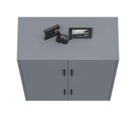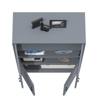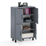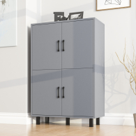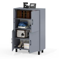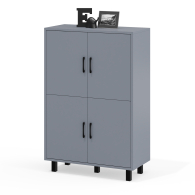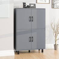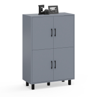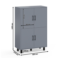 Тумба оборудована четырьмя распашными дверками, расположенными в два ряда по две – верхний и нижний. Размеры каждой створки составляют 530х380 мм, что обеспечивает удобство хранения и комфортный доступ к содержимому. За каждой парой дверок расположено отделение с полкой по центру, что позволяет эффективно организовать внутреннее пространство и хранить вещи в порядке. Тумба установлена на пять устойчивых металлических опор черного цвета высотой 100 мм, что придает конструкции современный вид и легкость. Для удобства использования створки открываются с помощью стильных металлических ручек длиной 128 мм, выполненных в минималистичном черном цвете.
