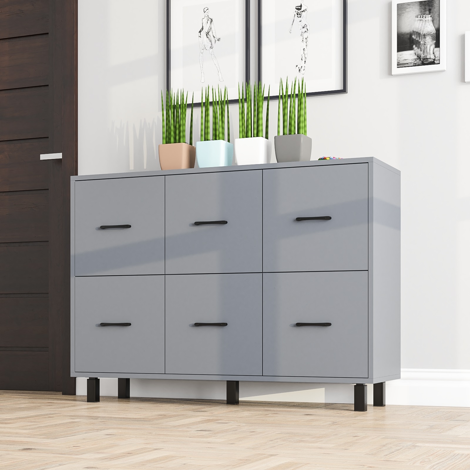 Комод оборудован шестью одинаковыми выдвижными ящиками, расположенными в два ряда по три – три сверху и три снизу. Размер фасадов ящиков составляет 365х386 мм, что позволяет хранить большое количество вещей, поддерживая порядок. Каждый ящик оснащен шариковыми направляющими длиной 350 мм, обеспечивающими плавное и бесшумное выдвижение. Конструкция комода установлена на пять металлических опор черного цвета высотой 100 мм, что придает изделию устойчивость и стильный внешний вид. Для удобства использования предусмотрены металлические ручки длиной 128 мм черного цвета, которые добавляют завершенности современному дизайну.