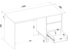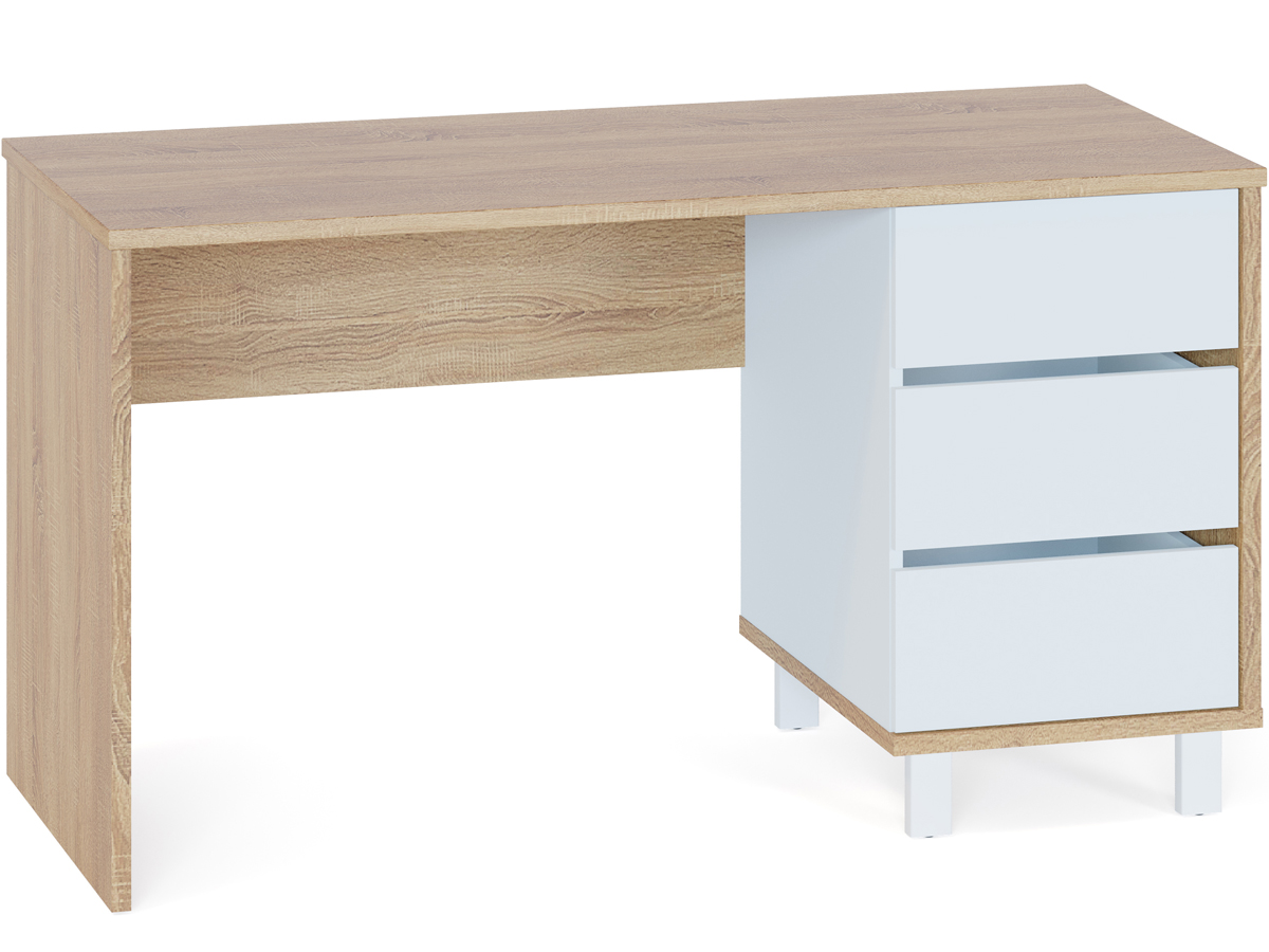 Лаконичный дизайн и отсутствие лицевой фурнитуры позволяют модели удачно вписаться в любой современный интерьер. Просторная столешница размером 1350*600 мм и тумба с тремя выдвижными ящиками дают возможность организовать функциональную систему хранения и разместить под рукой всё необходимое.