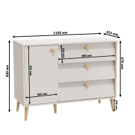 Вместительный комод оснащен дверкой и тремя выдвижными ящиками, предоставляя достаточно места для хранения одежды и аксессуаров. Ящики на шариковых направляющих полного выдвижения обеспечивают легкость в использовании и надежность. Элегантные деревянные ручки круглой формы, выполненные в цвете бук. Комод установлен на высокие опоры из массива бука, с высотой ножек 16 см, что придает ему визуальную легкость и устойчивость. Универсальная сборка позволяет расположить дверку и ящики в любом удобном порядке. Этот комод сочетает в себе практичность и элегантность, становясь идеальным дополнением вашего интерьера.