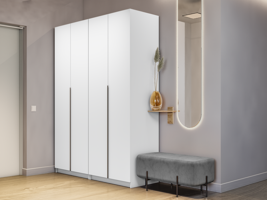 Благодаря надежным полкодержателям - штифтам, полки шкафа могут выдерживать до 15 кг. Вы сможете убрать сезонные вещи, постельное белье на верхние полки. Шкаф оснащен долговечной, ударостойкой кромкой ПВХ, которая защищает его торцы от сколов и повреждений, что обеспечит вам комфортное и долгое использование гардероба. Складная система дверей WingLine L экономит внешнее пространство за счет складывания дверей и обеспечивает их надежную фиксацию в открытом виде. Данный механизм обеспечивает плавный ход и исключает образование слепых зон. Система рассчитана на 40 000 циклов «открывание-закрывание». Шкаф оснащен удобной минималистичной ручкой, изготовленной из алюминия.