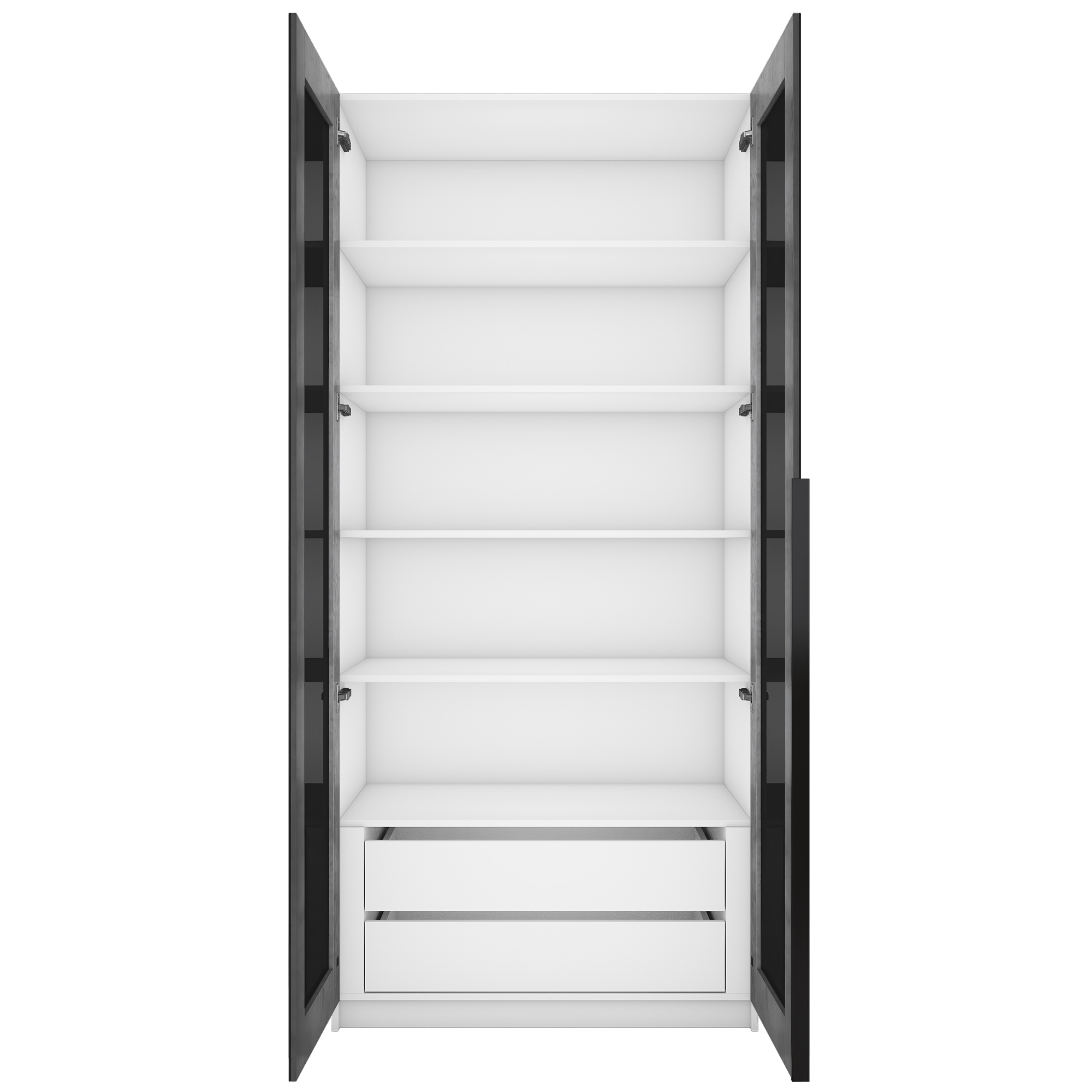 Шкаф распашной Е1 Локер 101x52.5x220 см, с черным стеклом , полками и модулем (Белый снег)