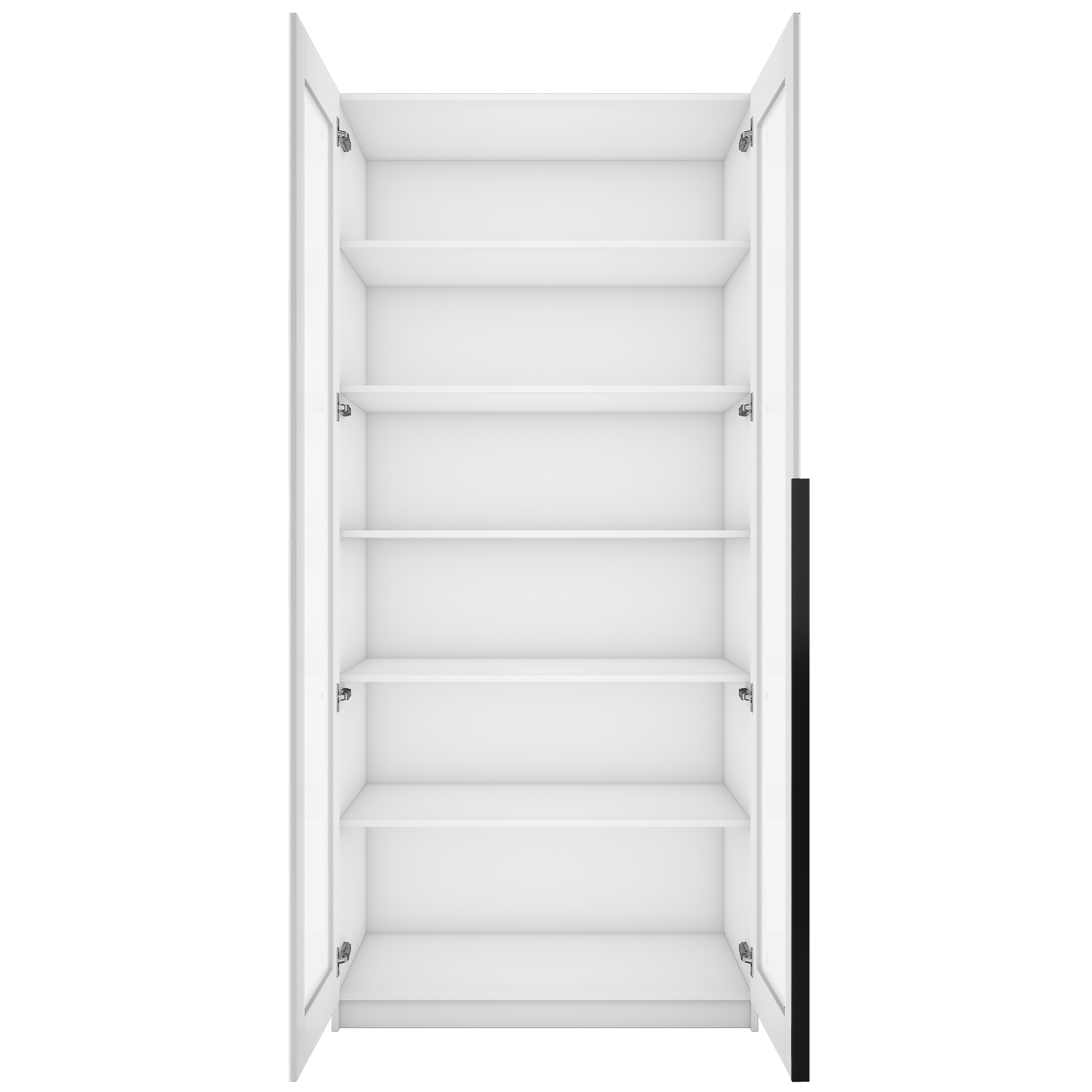 Фасады шкафа изготовлены из стекла белого цвета, оклеенного противоосколочной пленкой с внутренней рамкой из ЛДСП Белый снег.