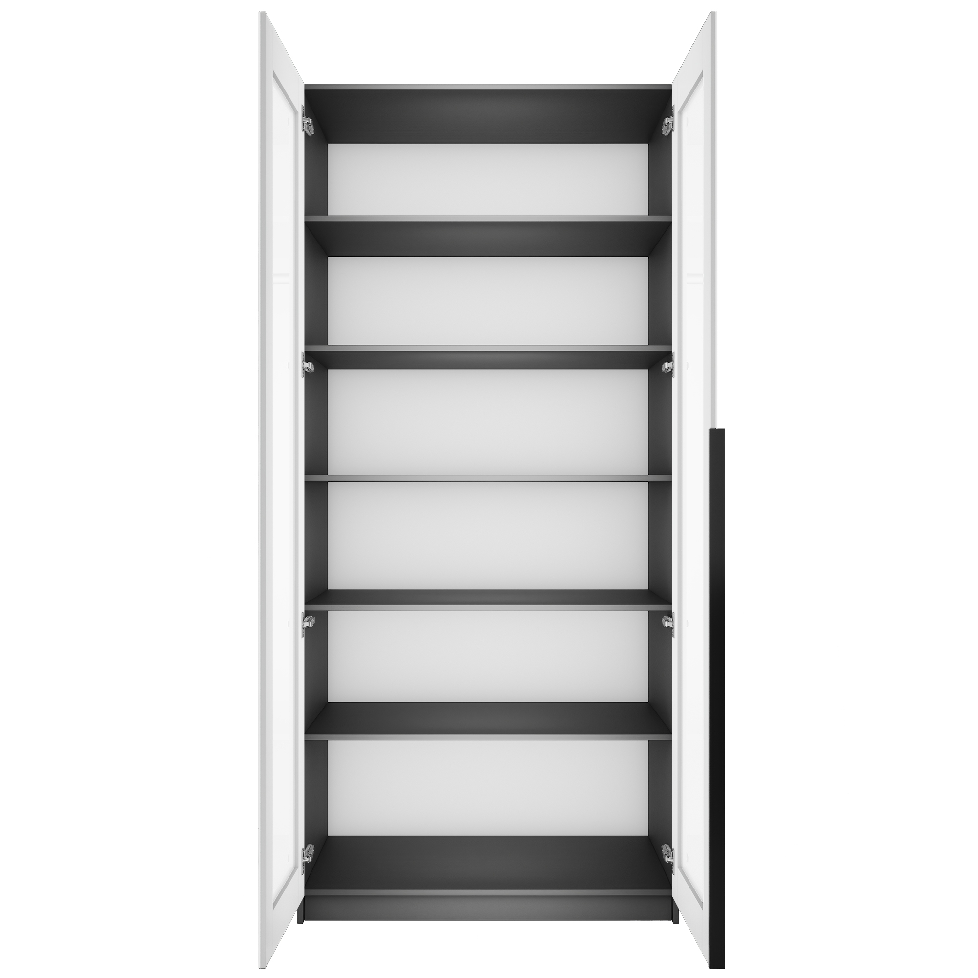 Фасады шкафа изготовлены из стекла белого цвета, оклеенного противоосколочной пленкой с внутренней рамкой из ЛДСП Белый снег.