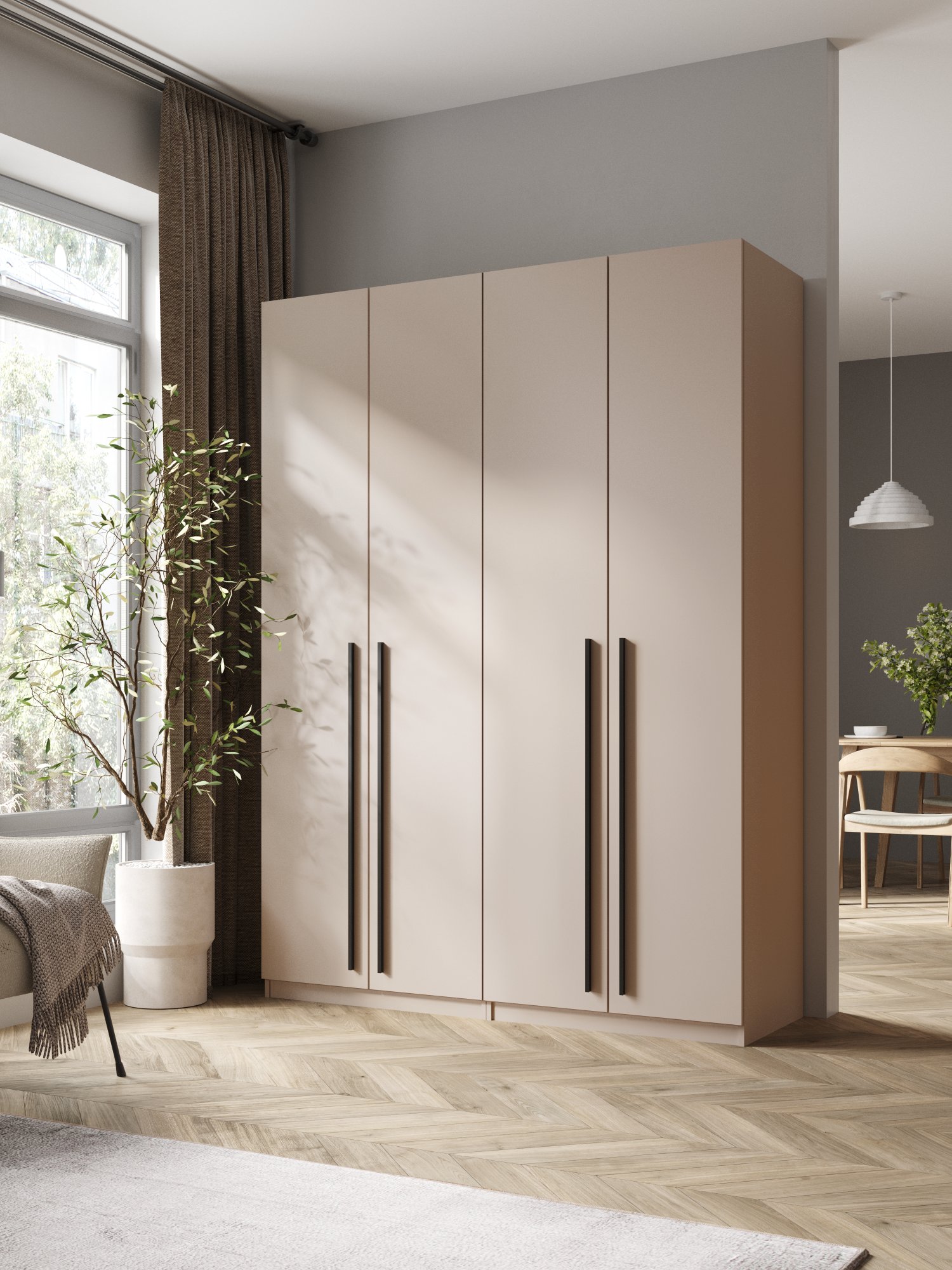 Этот шкаф для одежды оборудован выдвижными ящиками на бесшумных направляющих, что делает использование его удобным и практичным. С встроенными тумбами для белья он поможет организовать пространство таким образом, чтобы все необходимые предметы были под рукой.