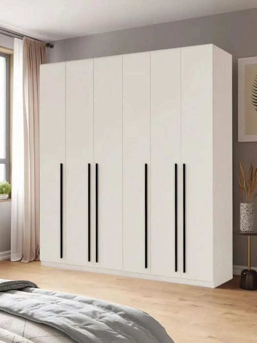 Шкаф отлично подойдет как для прихожей, так и для спальни, детской или гостиной. Он оборудован шестью дверцами, что обеспечивает удобный доступ к одежде и аксессуарам. Просторные отделения позволяют организовать хранение как верхней одежды, так и вещей, подходящих для более теплых сезонов. Вы можете без труда разместить здесь как платья, так и куртки, благодаря разнообразию внутренних полок и вешалок.
