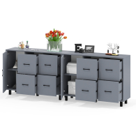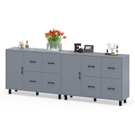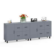 Каждый комод оснащен распашной дверкой с отделением с внутренней полкой, которая идеально подходит для хранения крупных вещей. С правой стороны расположены четыре выдвижных ящика, установленных в два ряда. Размер фасадов ящиков составляет (ШхВ) 386х365 мм. Все ящики оборудованы шариковыми направляющими длиной 350 мм, что обеспечивает плавное и тихое выдвижение. Обратите внимание, что комоды не имеют универсальной сборки - дверцы расположены только слева, а ящики – справа. Комоды установлены на прочные черные металлические опоры высотой 100 мм, которые придают конструкции легкость и устойчивость. Для удобства использования дверки и ящики открываются при помощи стильных металлических ручек длиной 128 мм черного цвета.