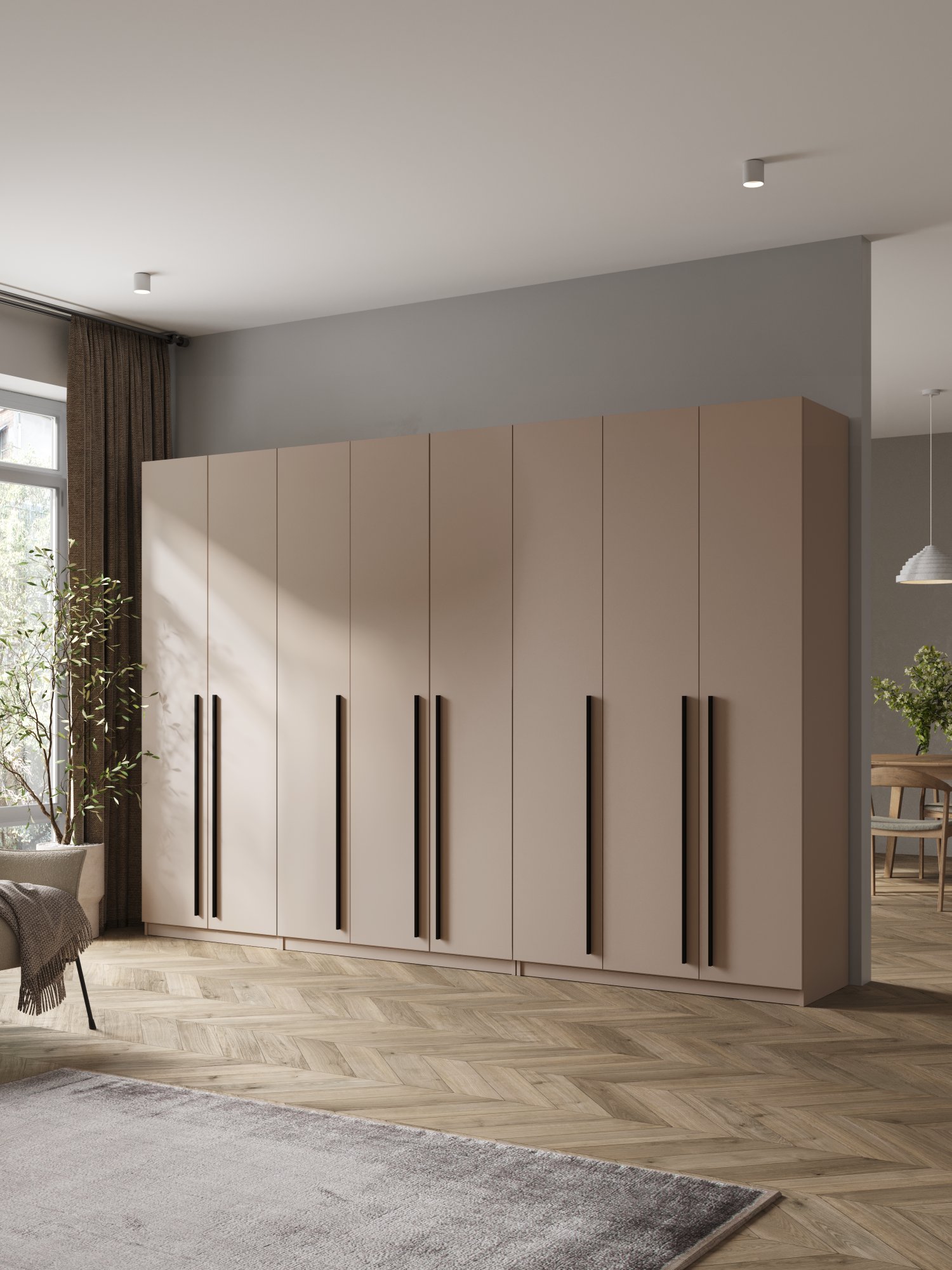 Представляем вашему вниманию просторный распашной шкаф для одежды с восьмью дверями, идеально подходящий для организации хранения вещей в вашем доме. Этот шкаф станет стильным дополнением любой комнаты - будь то прихожая, спальня, детская или гостиная. Его вместительность позволяет разместить большое количество одежды, обуви и аксессуаров, создавая порядок и уют.