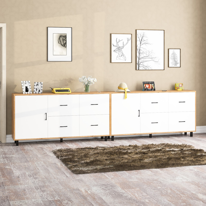 Каждый комод оснащен распашной дверкой (размеры створки (ШхВ) 533х732 мм) с отделением с внутренней полкой, которая идеально подходит для хранения крупных вещей. С правой стороны расположены четыре выдвижных ящика, установленных в два ряда. Размер фасадов ящиков составляет (ШхВ) 533х365 мм. Все ящики оборудованы шариковыми направляющими длиной 350 мм, что обеспечивает плавное и тихое выдвижение. Обратите внимание, что комоды не имеют универсальной сборки - дверцы расположены только слева, а ящики – справа. Комоды установлены на прочные черные металлические опоры высотой 100 мм, которые придают конструкции легкость и устойчивость. Для удобства использования дверки и ящики открываются при помощи стильных металлических ручек длиной 128 мм черного цвета.