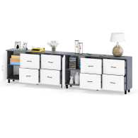 Каждый комод оснащен распашной дверкой (размеры створки (ШхВ) 533х732 мм) с отделением с внутренней полкой, которая идеально подходит для хранения крупных вещей. С правой стороны расположены четыре выдвижных ящика, установленных в два ряда. Размер фасадов ящиков составляет (ШхВ) 533х365 мм. Все ящики оборудованы шариковыми направляющими длиной 350 мм, что обеспечивает плавное и тихое выдвижение. Обратите внимание, что комоды не имеют универсальной сборки - дверцы расположены только слева, а ящики – справа. Комоды установлены на прочные черные металлические опоры высотой 100 мм, которые придают конструкции легкость и устойчивость. Для удобства использования дверки и ящики открываются при помощи стильных металлических ручек длиной 128 мм черного цвета.