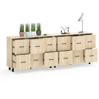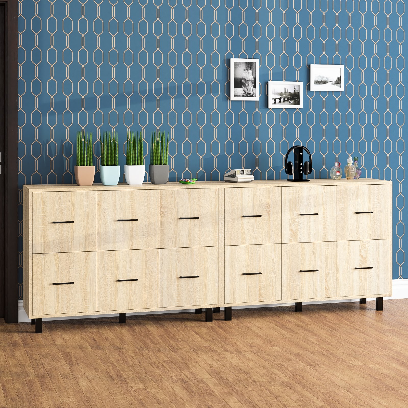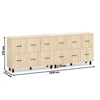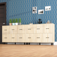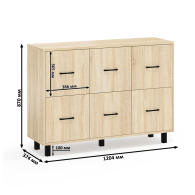Каждый комод оборудован шестью одинаковыми выдвижными ящиками, расположенными в два ряда (по три сверху и три снизу). Размер фасадов ящиков – 365х386 мм, ящики снабжены шариковыми направляющими длиной 350 мм, которые обеспечивают мягкое и надежное открывание. Комоды установлены на десять металлических опор черного цвета высотой 100 мм, придающих конструкции устойчивость и легкость. Металлические ручки длиной 128 мм в минималистичном стиле добавляют комодам изысканности и практичности.