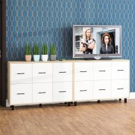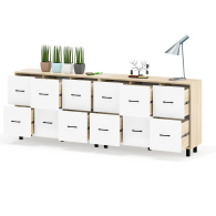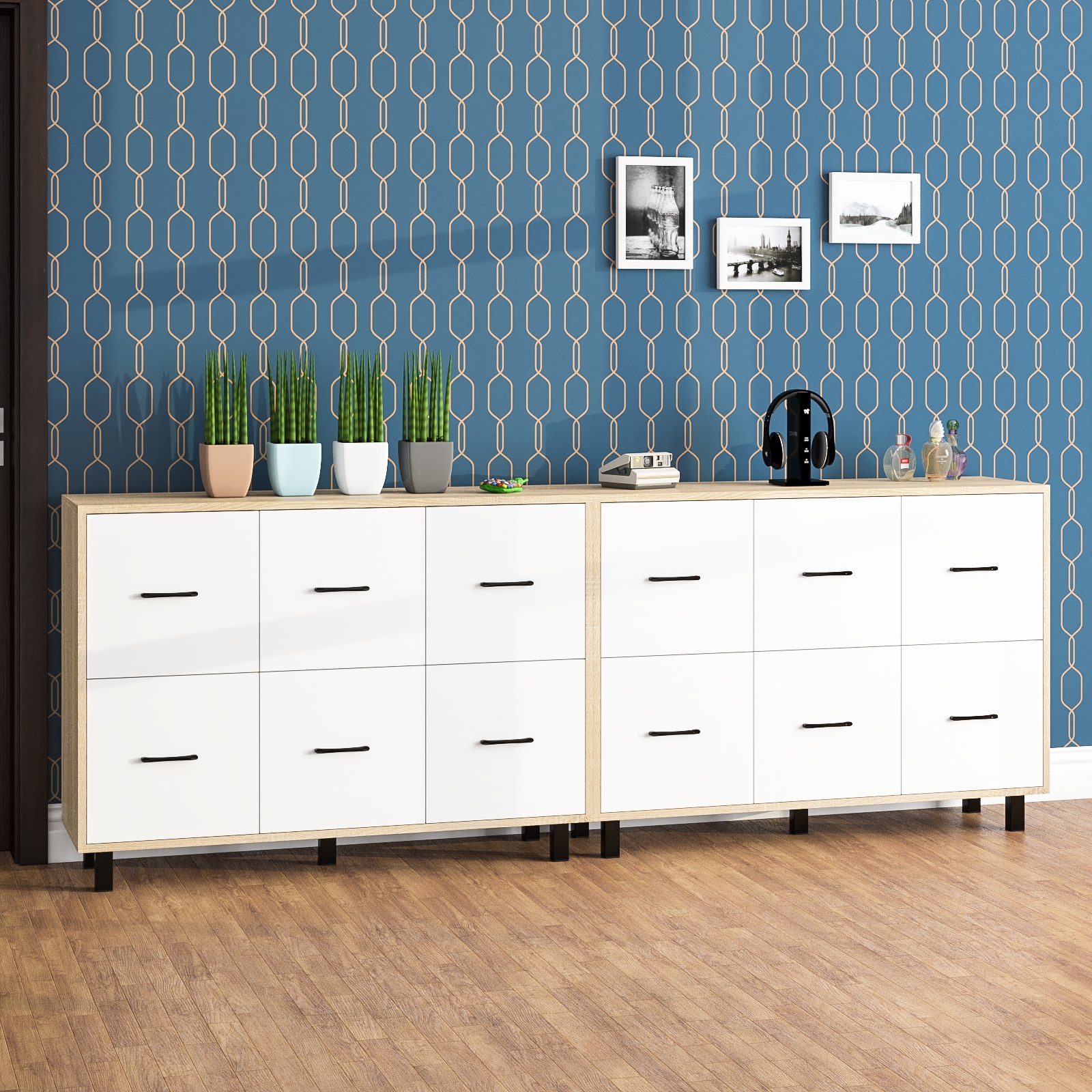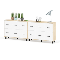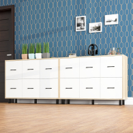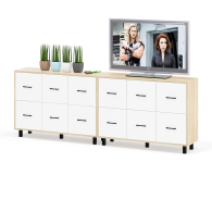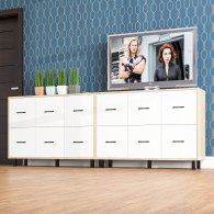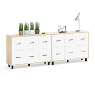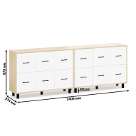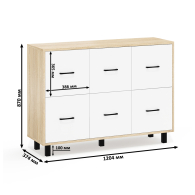 Каждый комод оборудован шестью одинаковыми выдвижными ящиками, расположенными в два ряда (по три сверху и три снизу). Размер фасадов ящиков – 365х386 мм, ящики снабжены шариковыми направляющими длиной 350 мм, которые обеспечивают мягкое и надежное открывание. Комоды установлены на десять металлических опор черного цвета высотой 100 мм, придающих конструкции устойчивость и легкость. Металлические ручки длиной 128 мм в минималистичном стиле добавляют комодам изысканности и практичности.