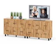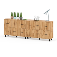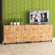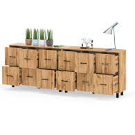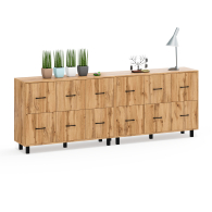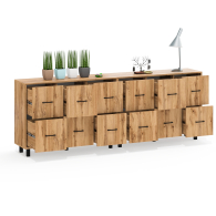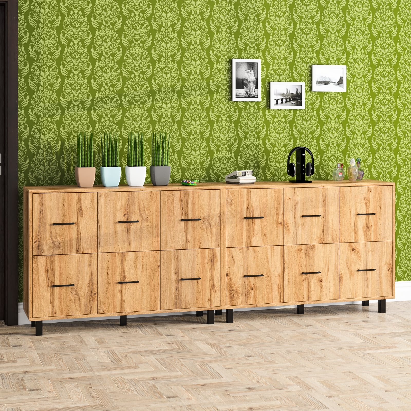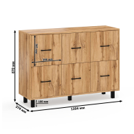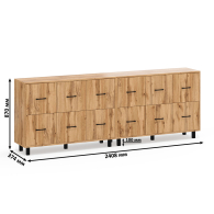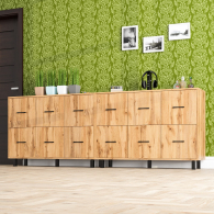 Каждый комод оборудован шестью одинаковыми выдвижными ящиками, расположенными в два ряда (по три сверху и три снизу). Размер фасадов ящиков – 365х386 мм, ящики снабжены шариковыми направляющими длиной 350 мм, которые обеспечивают мягкое и надежное открывание. Комоды установлены на десять металлических опор черного цвета высотой 100 мм, придающих конструкции устойчивость и легкость. Металлические ручки длиной 128 мм в минималистичном стиле добавляют комодам изысканности и практичности.