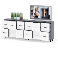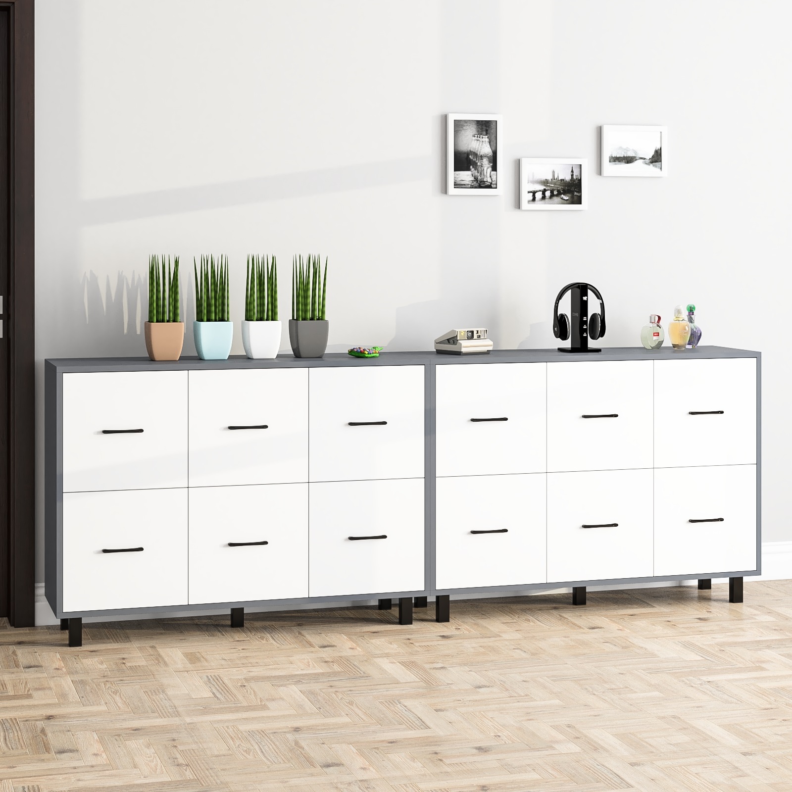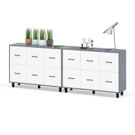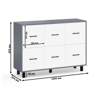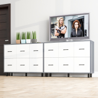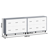 Каждый комод оборудован шестью одинаковыми выдвижными ящиками, расположенными в два ряда (по три сверху и три снизу). Размер фасадов ящиков – 365х386 мм, ящики снабжены шариковыми направляющими длиной 350 мм, которые обеспечивают мягкое и надежное открывание. Комоды установлены на десять металлических опор черного цвета высотой 100 мм, придающих конструкции устойчивость и легкость. Металлические ручки длиной 128 мм в минималистичном стиле добавляют комодам изысканности и практичности.