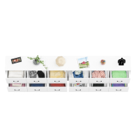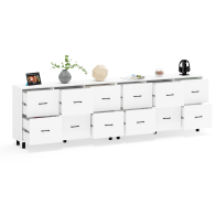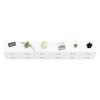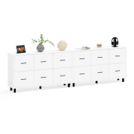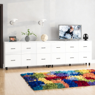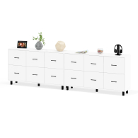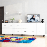 Каждый комод-тумба оборудован шестью одинаковыми выдвижными ящиками, расположенными в два ряда (по три сверху и три снизу). Размер фасадов ящиков – 365х486 мм, ящики снабжены шариковыми направляющими длиной 350 мм, которые обеспечивают мягкое и надежное открывание. Комоды установлены на десять металлических опор черного цвета высотой 100 мм, придающих конструкции устойчивость и легкость. Металлические ручки длиной 128 мм в минималистичном стиле добавляют комодам изысканности и практичности.