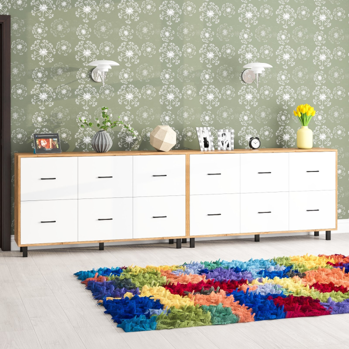 Каждый комод-тумба оборудован шестью одинаковыми выдвижными ящиками, расположенными в два ряда (по три сверху и три снизу). Размер фасадов ящиков – 365х486 мм, ящики снабжены шариковыми направляющими длиной 350 мм, которые обеспечивают мягкое и надежное открывание. Комоды установлены на десять металлических опор черного цвета высотой 100 мм, придающих конструкции устойчивость и легкость. Металлические ручки длиной 128 мм в минималистичном стиле добавляют комодам изысканности и практичности.