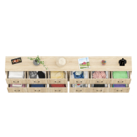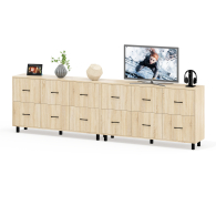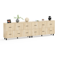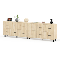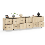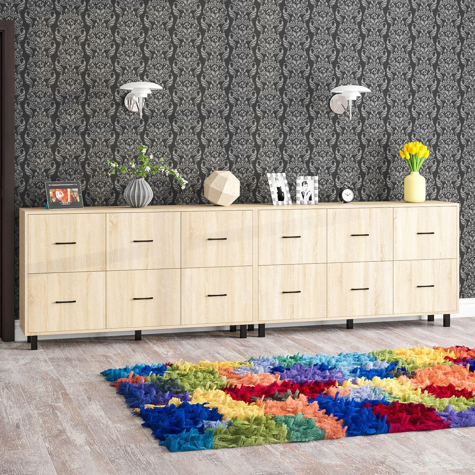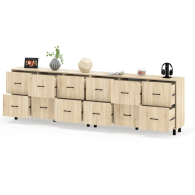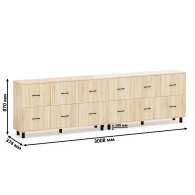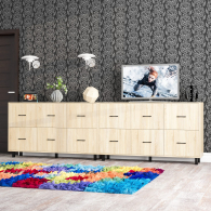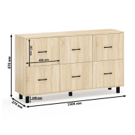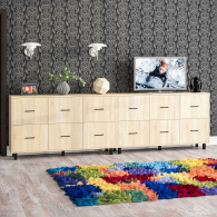 Каждый комод-тумба оборудован шестью одинаковыми выдвижными ящиками, расположенными в два ряда (по три сверху и три снизу). Размер фасадов ящиков – 365х486 мм, ящики снабжены шариковыми направляющими длиной 350 мм, которые обеспечивают мягкое и надежное открывание. Комоды установлены на десять металлических опор черного цвета высотой 100 мм, придающих конструкции устойчивость и легкость. Металлические ручки длиной 128 мм в минималистичном стиле добавляют комодам изысканности и практичности.