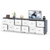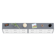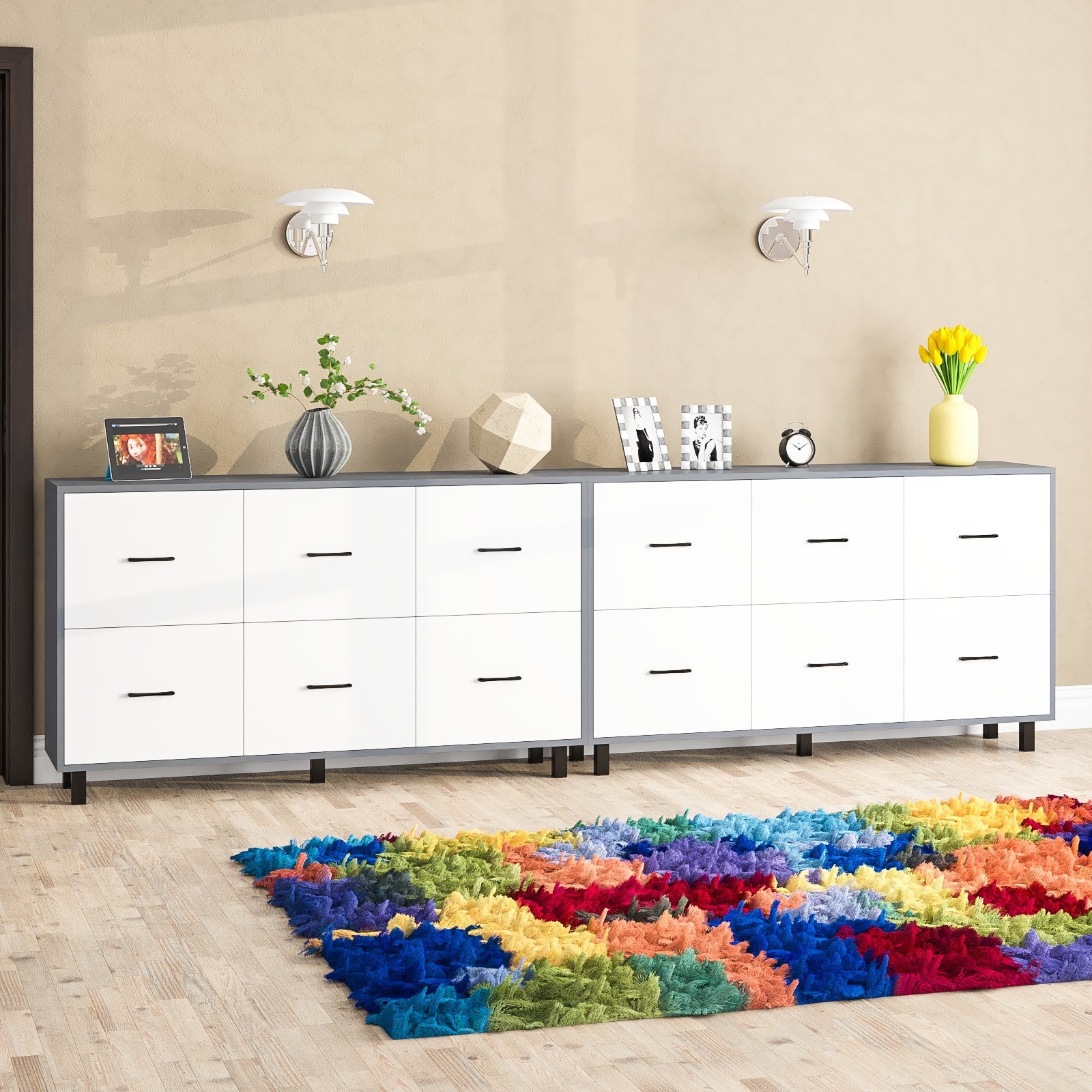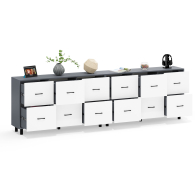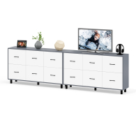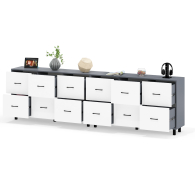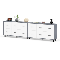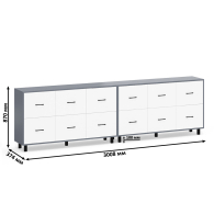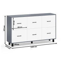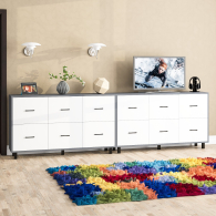 Каждый комод-тумба оборудован шестью одинаковыми выдвижными ящиками, расположенными в два ряда (по три сверху и три снизу). Размер фасадов ящиков – 365х486 мм, ящики снабжены шариковыми направляющими длиной 350 мм, которые обеспечивают мягкое и надежное открывание. Комоды установлены на десять металлических опор черного цвета высотой 100 мм, придающих конструкции устойчивость и легкость. Металлические ручки длиной 128 мм в минималистичном стиле добавляют комодам изысканности и практичности.