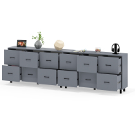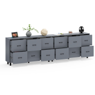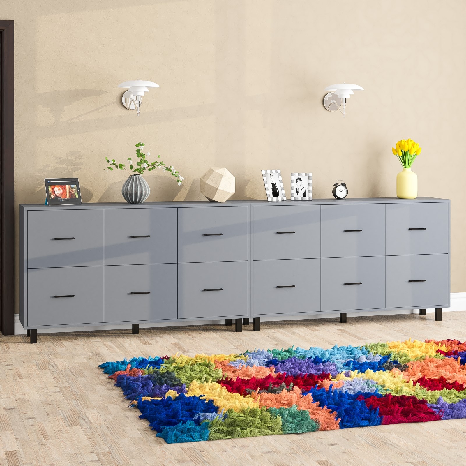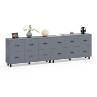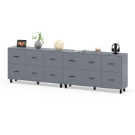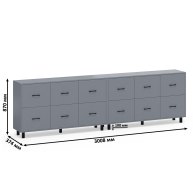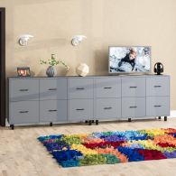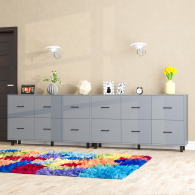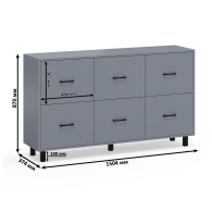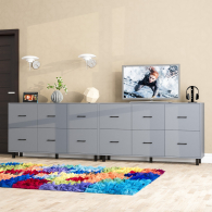 Каждый комод-тумба оборудован шестью одинаковыми выдвижными ящиками, расположенными в два ряда (по три сверху и три снизу). Размер фасадов ящиков – 365х486 мм, ящики снабжены шариковыми направляющими длиной 350 мм, которые обеспечивают мягкое и надежное открывание. Комоды установлены на десять металлических опор черного цвета высотой 100 мм, придающих конструкции устойчивость и легкость. Металлические ручки длиной 128 мм в минималистичном стиле добавляют комодам изысканности и практичности.