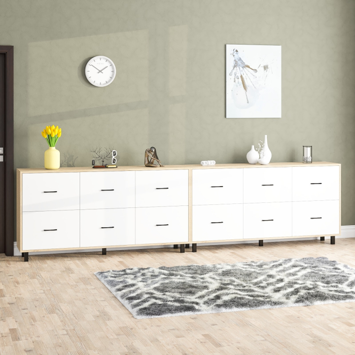 Каждый комод оборудован шестью одинаковыми выдвижными ящиками, расположенными в два ряда (по три сверху и три снизу). Размер фасадов ящиков – 365х552 мм, ящики снабжены шариковыми направляющими длиной 350 мм, которые обеспечивают мягкое и надежное открывание. Комоды установлены на десять металлических опор черного цвета высотой 100 мм, придающих конструкции устойчивость и легкость. Металлические ручки длиной 128 мм в минималистичном стиле добавляют комодам изысканности и практичности.