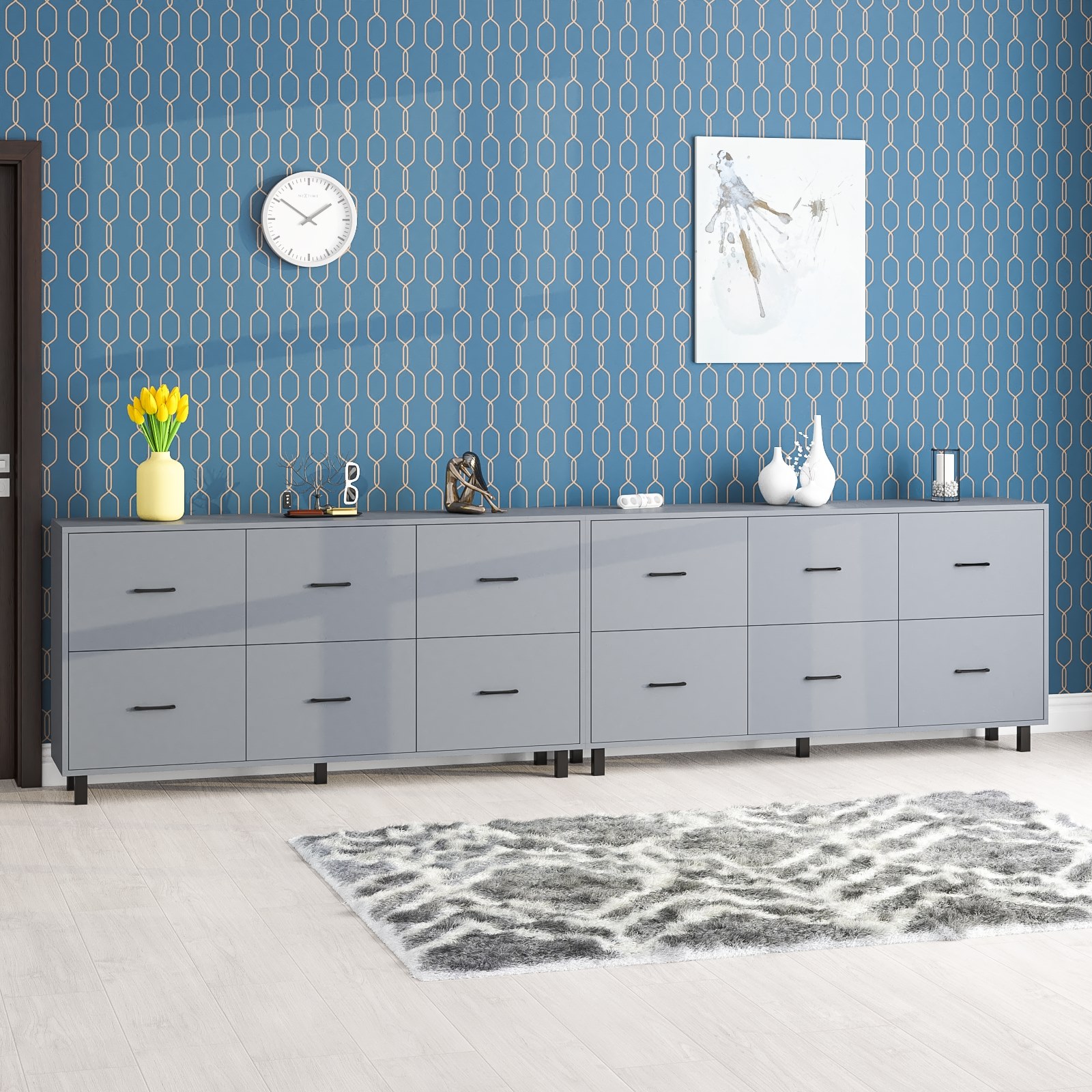 Каждый комод оборудован шестью одинаковыми выдвижными ящиками, расположенными в два ряда (по три сверху и три снизу). Размер фасадов ящиков – 365х552 мм, ящики снабжены шариковыми направляющими длиной 350 мм, которые обеспечивают мягкое и надежное открывание. Комоды установлены на десять металлических опор черного цвета высотой 100 мм, придающих конструкции устойчивость и легкость. Металлические ручки длиной 128 мм в минималистичном стиле добавляют комодам изысканности и практичности.
