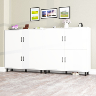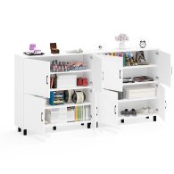 Каждая тумба оборудована четырьмя распашными дверками, расположенными в два ряда (по две в каждом). Размеры створок составляют 530х580 мм. За каждой парой дверок расположено просторное отделение с полкой по центру, которое позволяет эффективно организовать хранение. Тумбы установлены на десять устойчивых металлических опор черного цвета высотой 100 мм, что придает конструкции легкость и современный вид. Створки открываются с помощью металлических ручек длиной 128 мм, выполненных в минималистичном стиле.