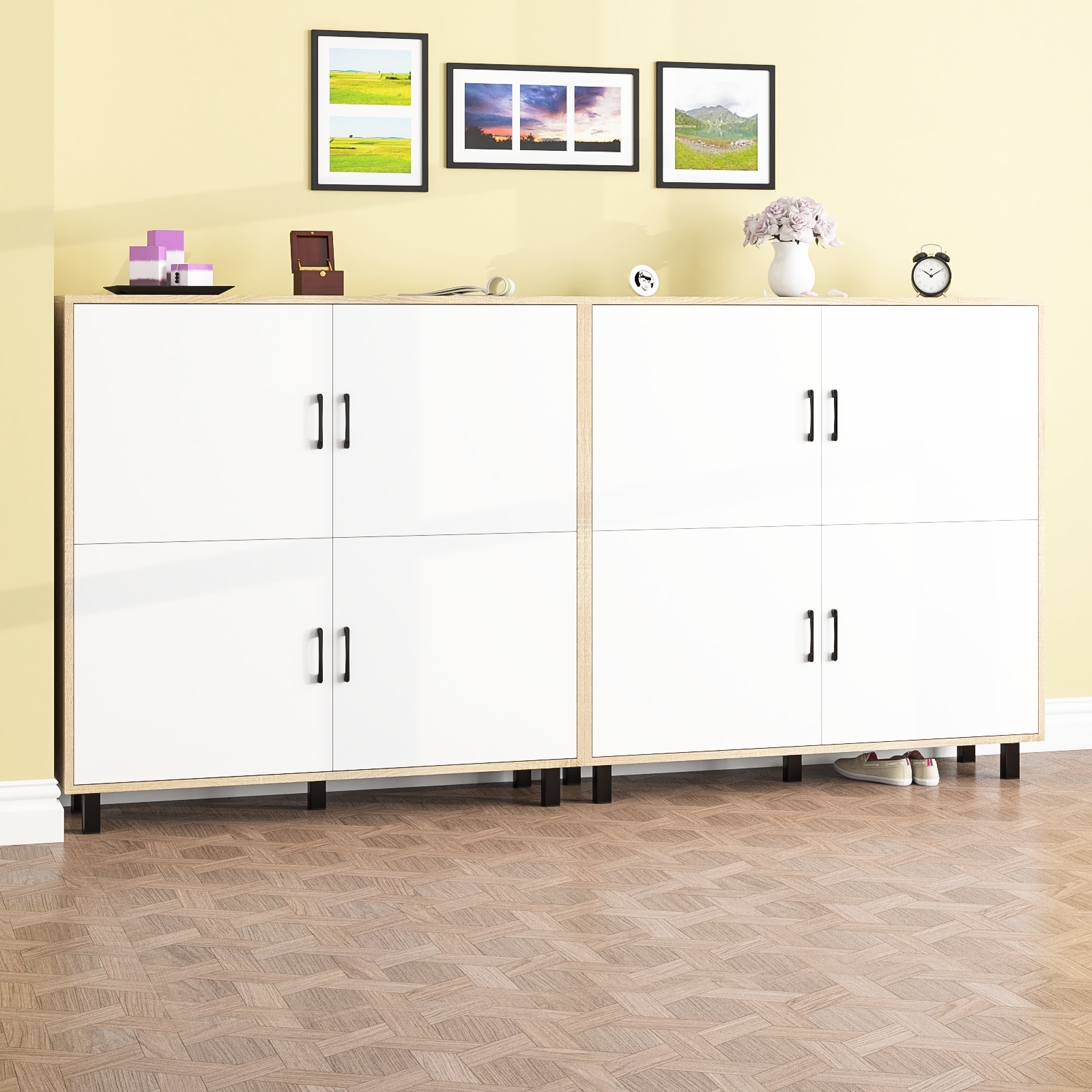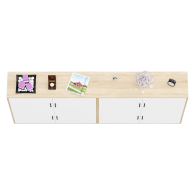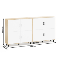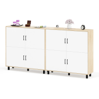 Каждая тумба оборудована четырьмя распашными дверками, расположенными в два ряда (по две в каждом). Размеры створок составляют 530х580 мм. За каждой парой дверок расположено просторное отделение с полкой по центру, которое позволяет эффективно организовать хранение. Тумбы установлены на десять устойчивых металлических опор черного цвета высотой 100 мм, что придает конструкции легкость и современный вид. Створки открываются с помощью металлических ручек длиной 128 мм, выполненных в минималистичном стиле.