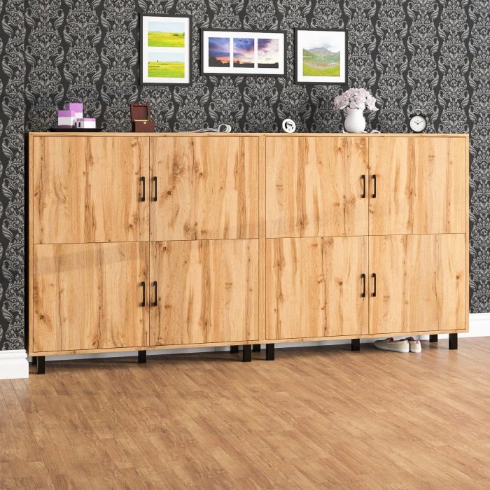 Каждая тумба оборудована четырьмя распашными дверками, расположенными в два ряда (по две в каждом). Размеры створок составляют 530х580 мм. За каждой парой дверок расположено просторное отделение с полкой по центру, которое позволяет эффективно организовать хранение. Тумбы установлены на десять устойчивых металлических опор черного цвета высотой 100 мм, что придает конструкции легкость и современный вид. Створки открываются с помощью металлических ручек длиной 128 мм, выполненных в минималистичном стиле.