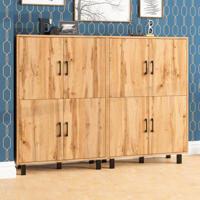 Каждая тумба оборудована четырьмя распашными дверками, расположенными в два ряда (по две в каждом). Размеры створок составляют 530х380 мм. За каждой парой дверок расположено просторное отделение с полкой по центру, которое позволяет эффективно организовать хранение. Тумбы установлены на десять устойчивых металлических опор черного цвета высотой 100 мм, что придает конструкции легкость и современный вид. Створки открываются с помощью металлических ручек длиной 128 мм, выполненных в минималистичном стиле.