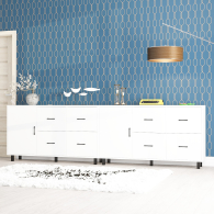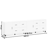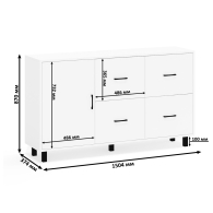 Каждый комод-тумба оснащен распашной дверкой (размеры створки (ШхВ) 486х732 мм) с отделением с внутренней полкой, которая идеально подходит для хранения крупных вещей. С правой стороны расположены четыре выдвижных ящика, установленных в два ряда. Размер фасадов ящиков составляет (ШхВ) 486х365 мм. Все ящики оборудованы шариковыми направляющими длиной 350 мм, что обеспечивает плавное и тихое выдвижение. Обратите внимание, что комоды-тумбы не имеют универсальной сборки - дверцы расположены только слева, а ящики – справа. Комоды-тумбы установлены на прочные черные металлические опоры высотой 100 мм, которые придают конструкции легкость и устойчивость. Для удобства использования дверки и ящики открываются при помощи стильных металлических ручек длиной 128 мм черного цвета.