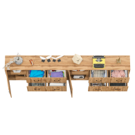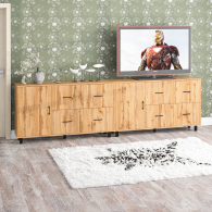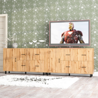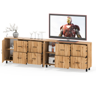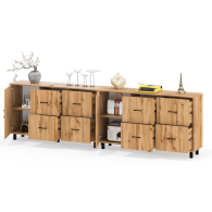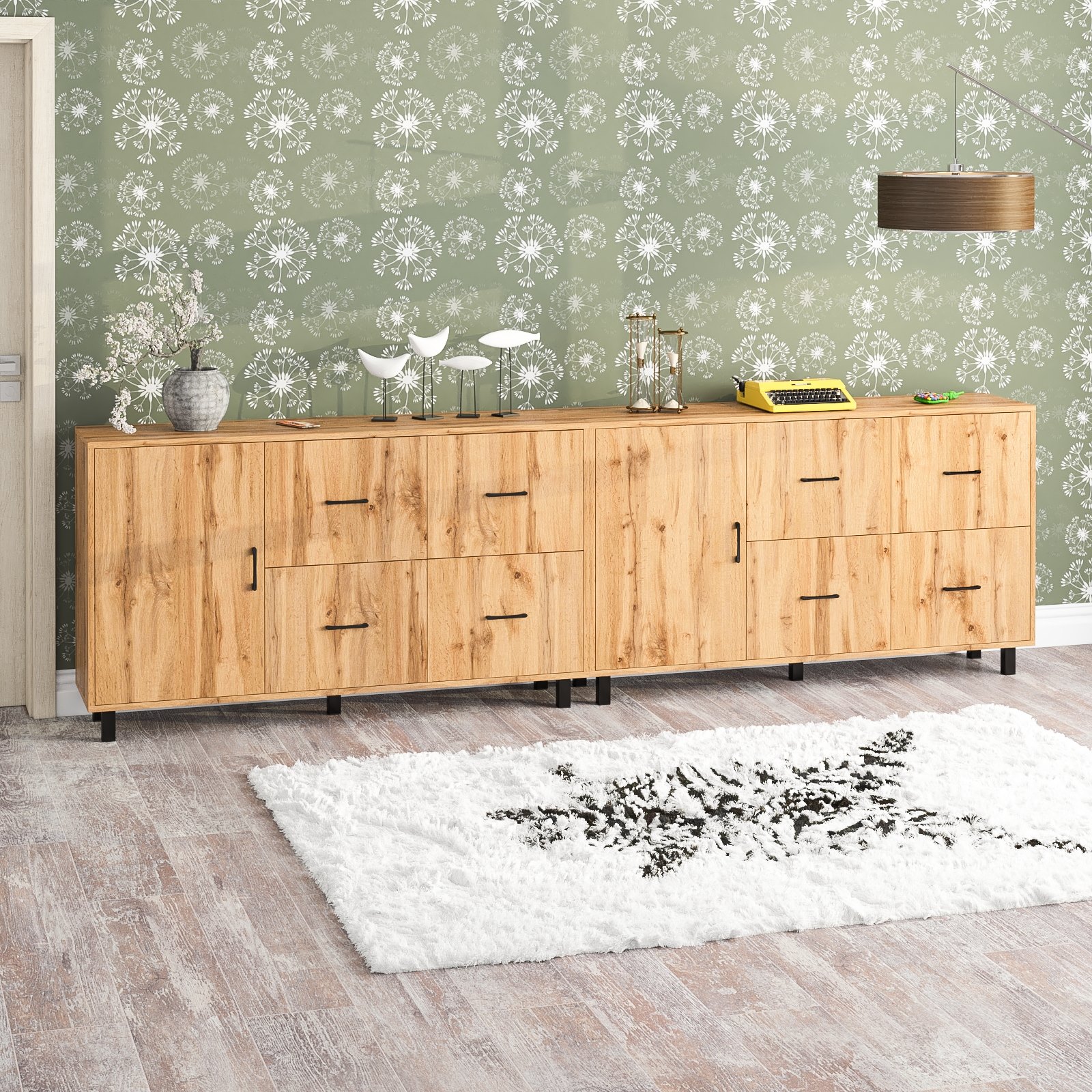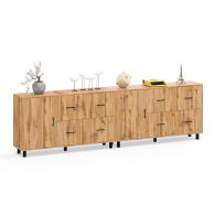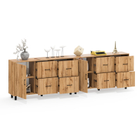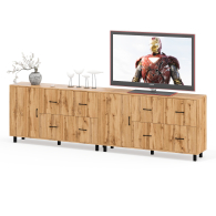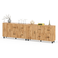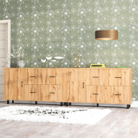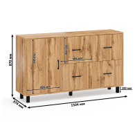 Каждый комод-тумба оснащен распашной дверкой (размеры створки (ШхВ) 486х732 мм) с отделением с внутренней полкой, которая идеально подходит для хранения крупных вещей. С правой стороны расположены четыре выдвижных ящика, установленных в два ряда. Размер фасадов ящиков составляет (ШхВ) 486х365 мм. Все ящики оборудованы шариковыми направляющими длиной 350 мм, что обеспечивает плавное и тихое выдвижение. Обратите внимание, что комоды-тумбы не имеют универсальной сборки - дверцы расположены только слева, а ящики – справа. Комоды-тумбы установлены на прочные черные металлические опоры высотой 100 мм, которые придают конструкции легкость и устойчивость. Для удобства использования дверки и ящики открываются при помощи стильных металлических ручек длиной 128 мм черного цвета.